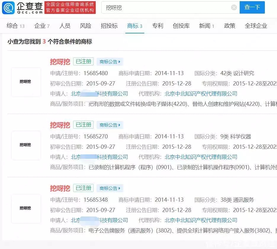 企查查APP顯示,“挖呀挖”已經(jīng)被北京某科技公司申請(qǐng)注冊(cè)成商標(biāo),國(guó)際分類為設(shè)計(jì)研究、科學(xué)儀器、通訊服務(wù),3枚商標(biāo)狀態(tài)均為“已注冊(cè)”。
